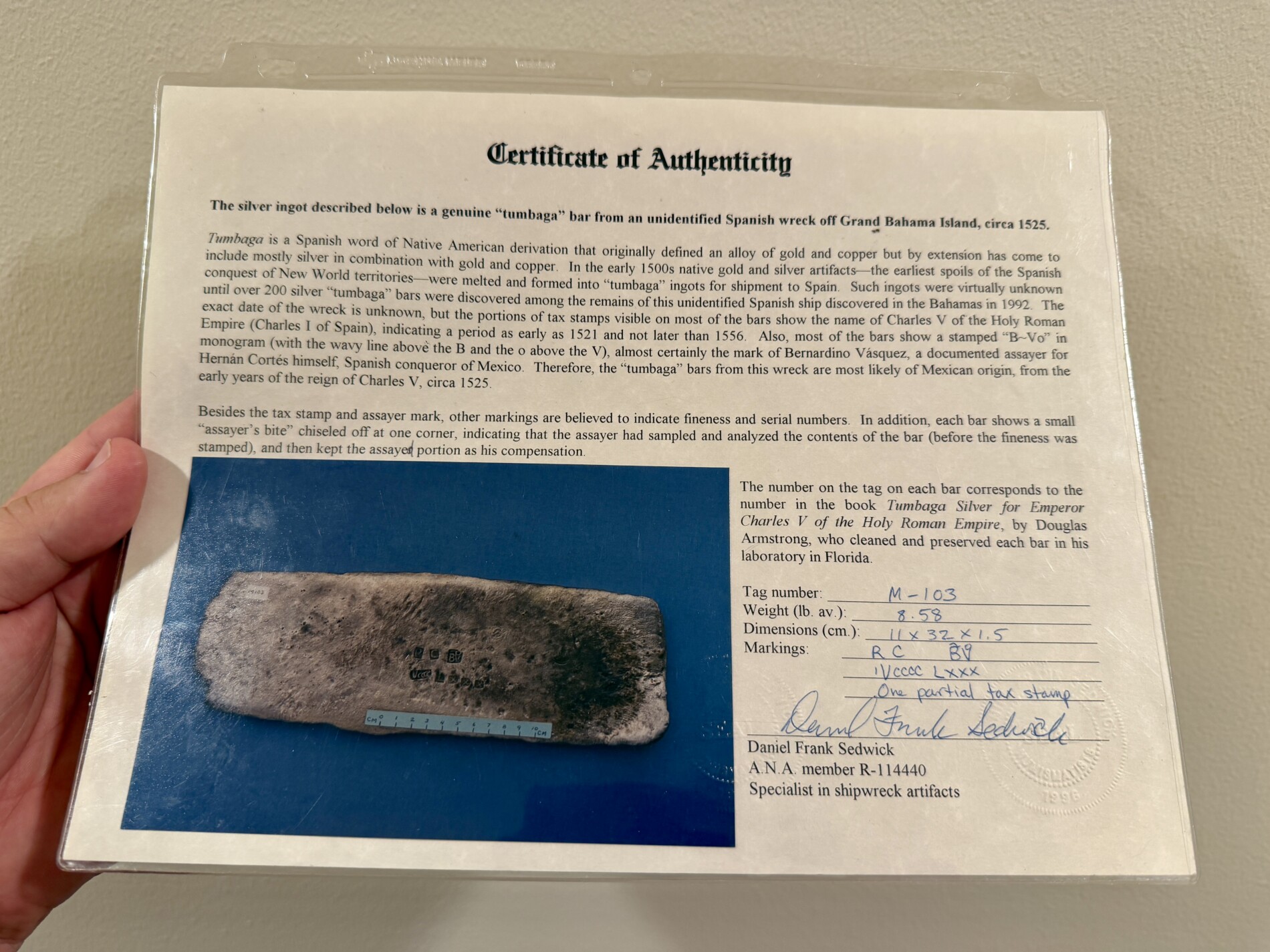 Item #CC-0879 | 1525 Tumbaga Shipwreck Silver Bar with COA