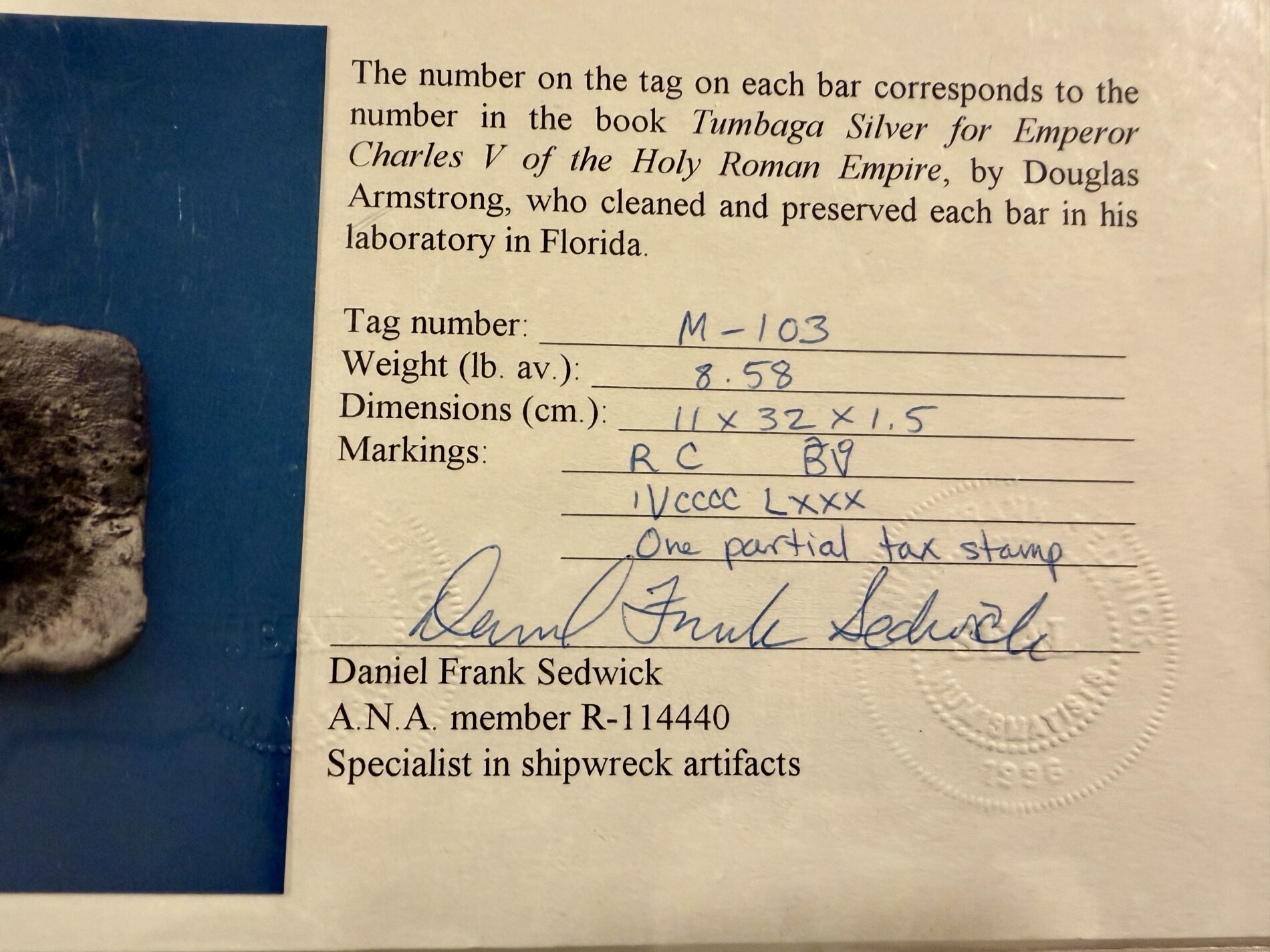 Description: This outstanding silver bar from the famed “Tumbaga Wreck” One of the best silver bars we have seen in recent years. The bar is a wonderful example with clear struck stamps and markings, a small assayer’s bite taken from one corner, weighs 8.58 pounds, and comes with it’s original certificate and book. It is rare that all accompanying paperwork is included after 30 years, so this is a complete item! The bar’s tag number is M-103, which matches the book and COA it is accompanied by. The Tumbaga wreck is the first wreck of the New World and the bars made would have been from silver, copper and gold retrieved by Hernan Cortes and his men during their conquest of Mexico.