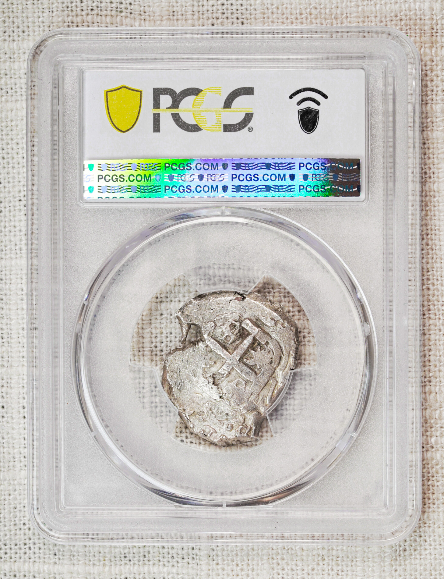 Description: A fantastic 2 reales example from a period at the mint where much of the coins were crude and lower quality. This 1765 2 reales struck in Potosi boasts great centering, much of the intended details of the die strike, and a unique shape. A bit of silver from the planchet forms what looks like a seahorse on the upper right of the obverse of the coin. This specimen is full weight, with a beautiful natural silver patina to it.